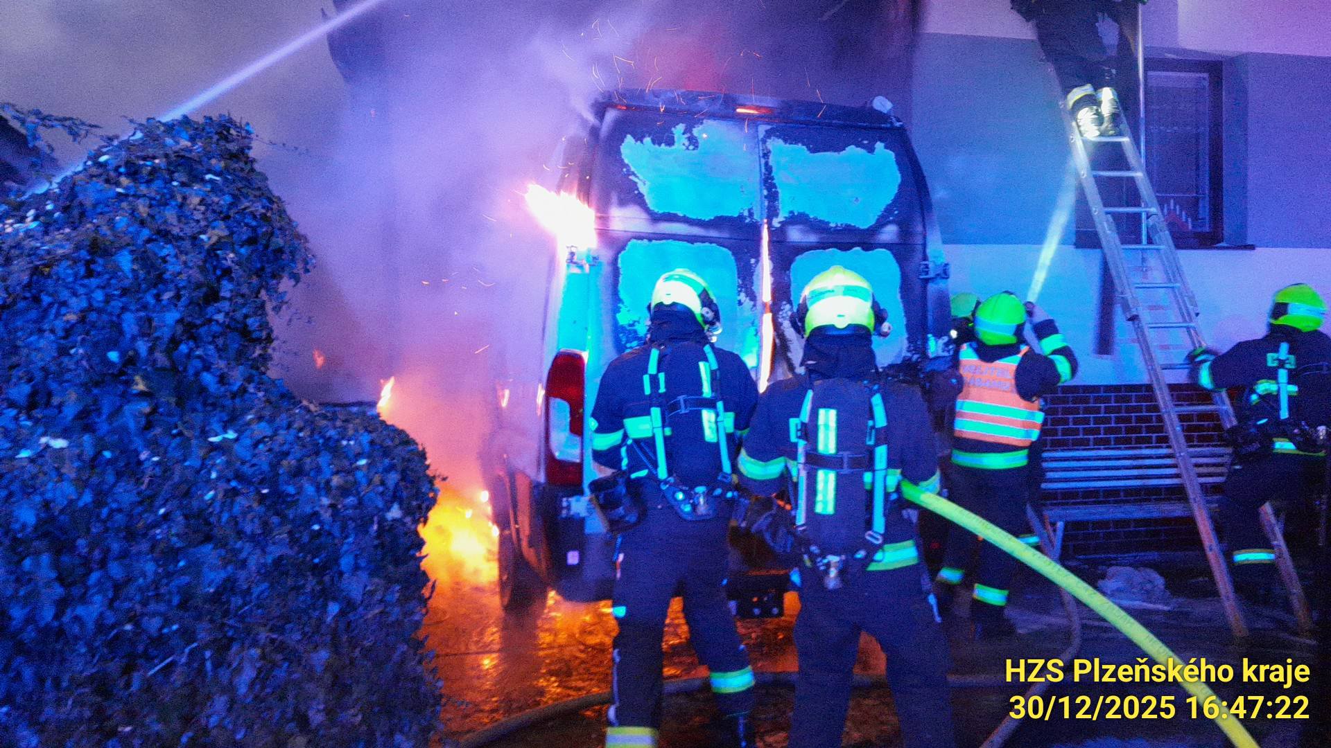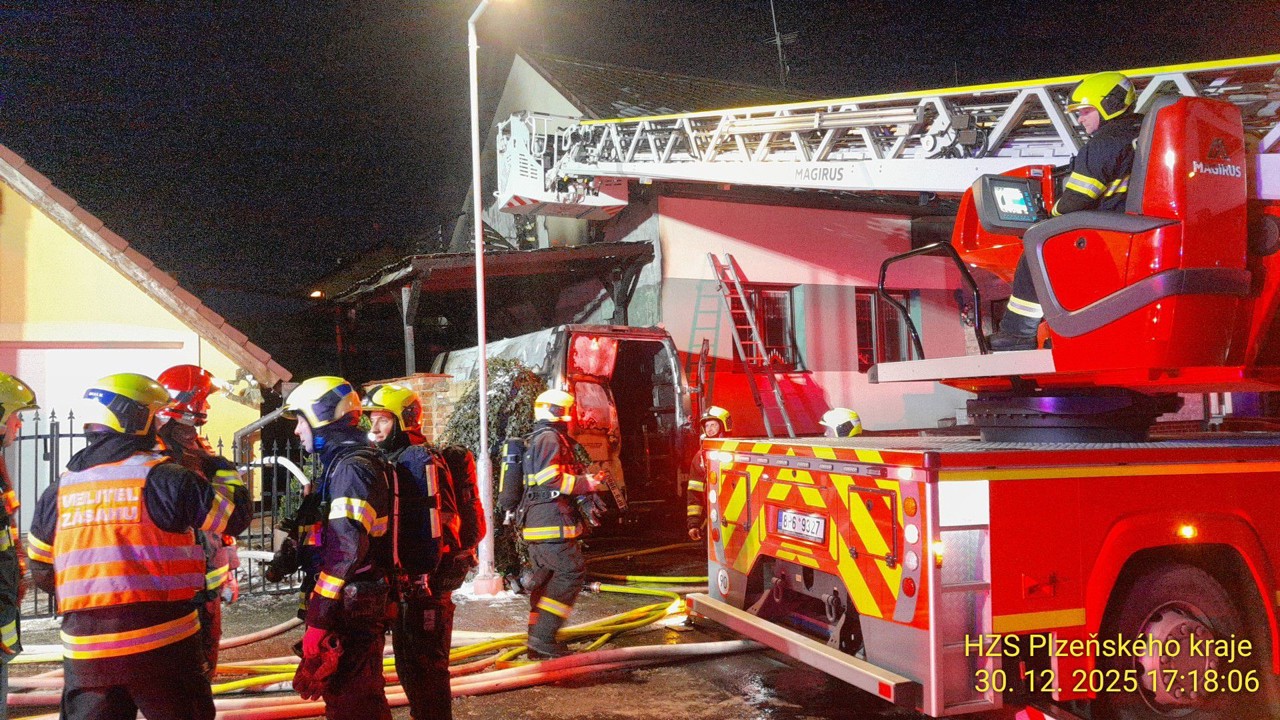 K požáru v Lidické ulici v Tlučné vyjížděli profesionální i dobrovolní hasiči kolem 16:30. "V Lidické ulici v Tlučné zasahujeme u požáru obytné dodávky pod přístřeškem rodinného domu. Oheň se částečně přenesl i na rodinný dům. Provádime rozebírání střešních konstrukcí. Z domu jsme vynesli dvě kočky," popsal mluvčí krajských hasičů Petr Poncar s tím, že vzhledem k namrzání okolních komunikaci požádali hasiči silničáře o posyp.
