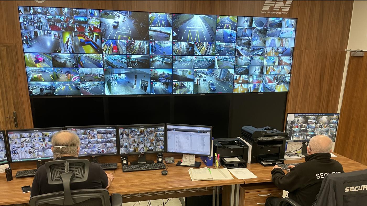 Více než 400 kamer dohlíží na bezpečnost v celé Fakultní nemocnici v Plzni. Samotným srdcem je tzv. Bezpečnostní velín, který v nepřetržitém režimu zajišťuje trvalý monitoring bezpečnostní situace v obou areálech za využití nejmodernější techniky.
