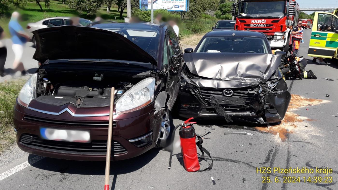 Tři lidé se zranili při nehodě dvou osobních vozidel a motocyklu, která se stala dnes odpoledne na Vejprnické třídě na výjezdu ze Skvrňan. Po dobu zásahu musela být silnice uzavřena.