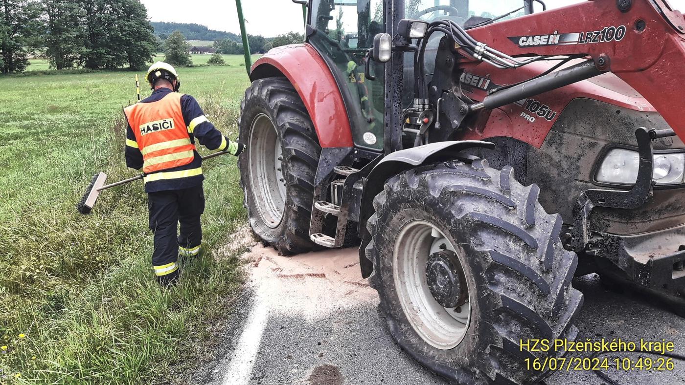 K nehodě došlo v půl 11. "Traktor byl osazen čelním nakladačem na balíky a valníkem. Čelní nakladač bohužel z traktoru za jízdy upadl, a byl samotným, traktorem přejet. Důsledkem toho jsou na traktoru proraženy všechny čtyři pneumatiky a nádrž na naftu," uvedl mluvčí hasičů Michal Holeček s tím, že jednotka tento únik zastavila a také zasypala již uniklé množství nafty.