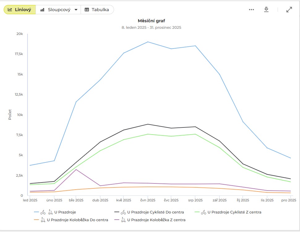 Od 8. ledna 2025 do konce loňského roku na cyklostezce U Prazdroje projelo přes 117 tisíc cyklistů a více než 24 tisíc koloběžek. Snímač v Karlovarské ulici za zmíněnou dobu zaznamenal 125 876 cyklistů a přes 102 tisíc koloběžek. Nejfrekventovanějšími dny byly v loňském roce úterý a čtvrtek. A průměry jsou 396 U Prazdroje a 638 cyklistů v Karlovarské za den. Z dat rovněž vyplynulo, že nejvíce cyklistů projelo úsekem U Prazdroje 13. března a kolem Rondelu 19. června. Březnový vrchol může ukazovat na nástup jarní sezóny a červnový rekord pravděpodobně souvisí s letním počasím a cestami za rekreací k Boleveckým rybníkům.