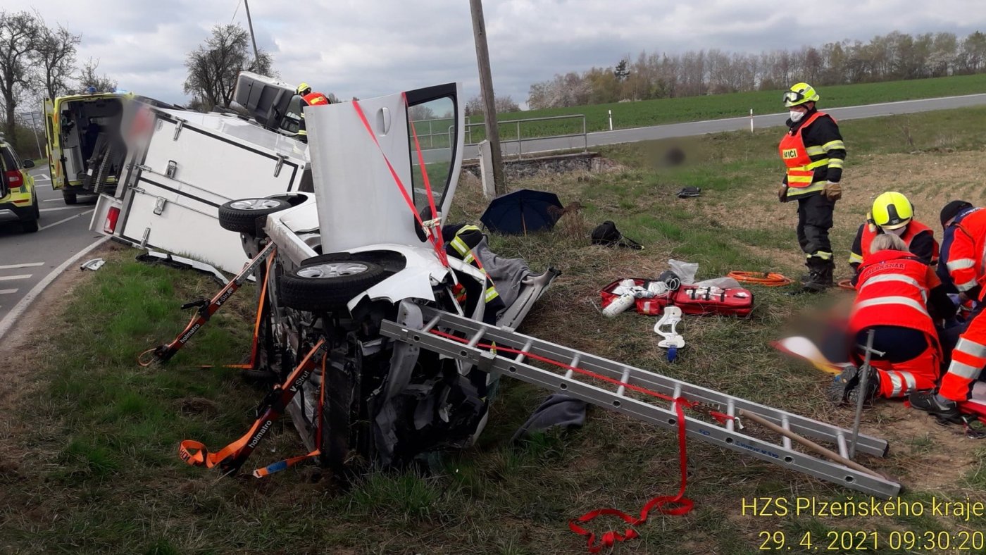 Nehoda se stala krátce po 9. hodině na křižovatce komunikací 2045/III a 2046/III mezi Všeruby a Kunějovicemi. "Jednu osobu jsme museli vyprostit pomocí hydraulických nástrojů," uvedl mluvčí krajských hasičů Petr Poncar. Podle mluvčí krajské záchranné služby Márie Svobodové utrpěl muž ročník 1946 středně těžká zranění. "Při vědomí jsme ho transportovali na urgentní příjem Fakultní nemocnice v Plzni," dodala.
