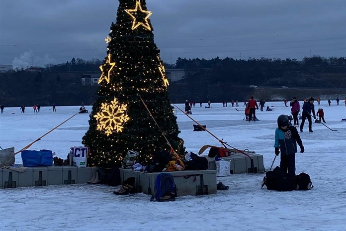 Plovoucí pontony, které v létě slouží rekreantům a v zimě nesou vánoční strom, získaly s příchodem mrazů novou funkci. Zamrzly v ledu tak pevně, že nyní bruslařům slouží jako ideální místo pro odpočinek nebo přezutí bruslí.